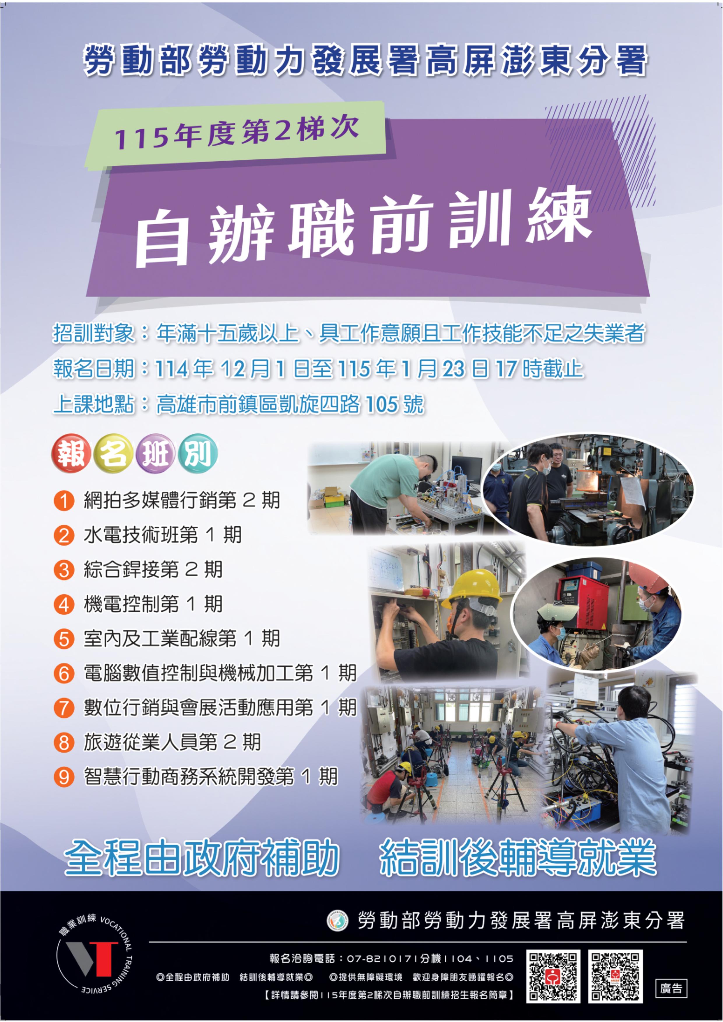 職群介紹 關於自辦職前訓練,乃指高屏澎東分署為因應社會及國家經濟發展,提升勞工就業技能,針對民間無法或困難辦理的職類,運用政府預算購置設備設施與聘用專業師資,在分署自有空間規畫辦理的職前訓練,使待業勞工獲得專業技能,促進其就業。